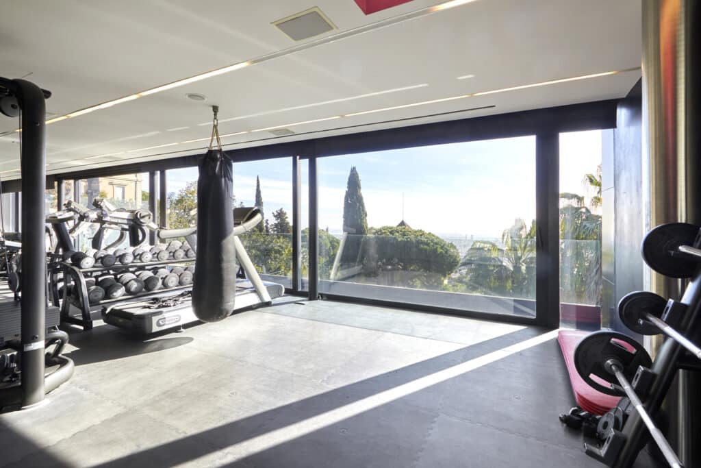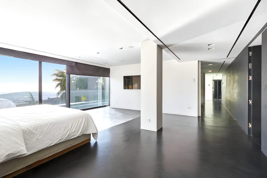 Spanning over 1,000 m² across four levels, the residence is designed around light and proportion. Floor-to-ceiling windows frame the hillside setting, while open-plan living and dining areas extend naturally onto terraces and outdoor spaces. The architectural layout balances generous entertaining areas with intimate private quarters.