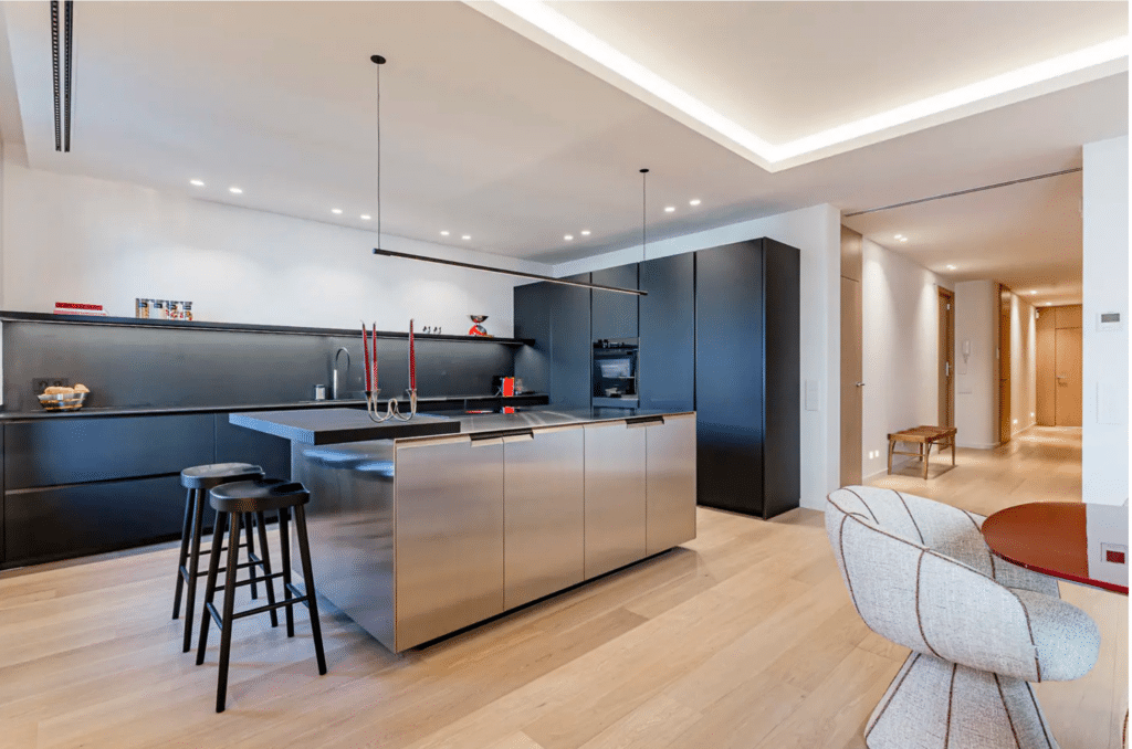 The day area features a spacious living-dining room and a fully exterior designer kitchen with direct access to balconies overlooking the street. The Poliform kitchen, complete with a central island, combines refined contemporary design with excellent storage and premium appliances, while custom lighting by Santa & Cole, Catellani & Smith, and Davide Groppi enhances the warm, modern ambiance throughout.