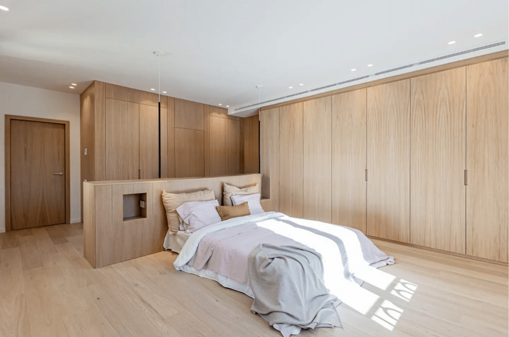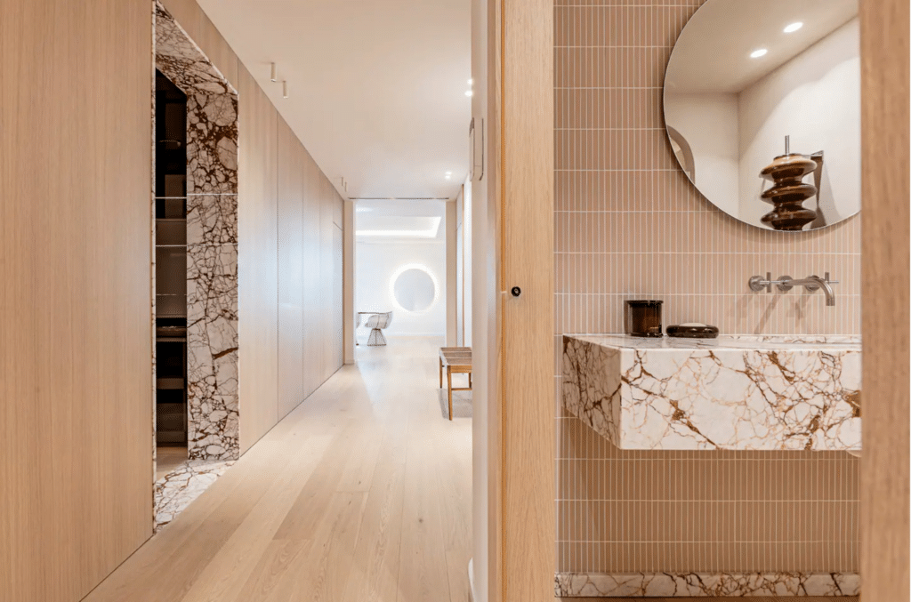 Natural oak flooring and bespoke wood paneling run throughout the apartment, complemented by ducted air conditioning and heating, while Calacatta Viola marble features prominently in the bathrooms, select door frames, and fireplace cladding.