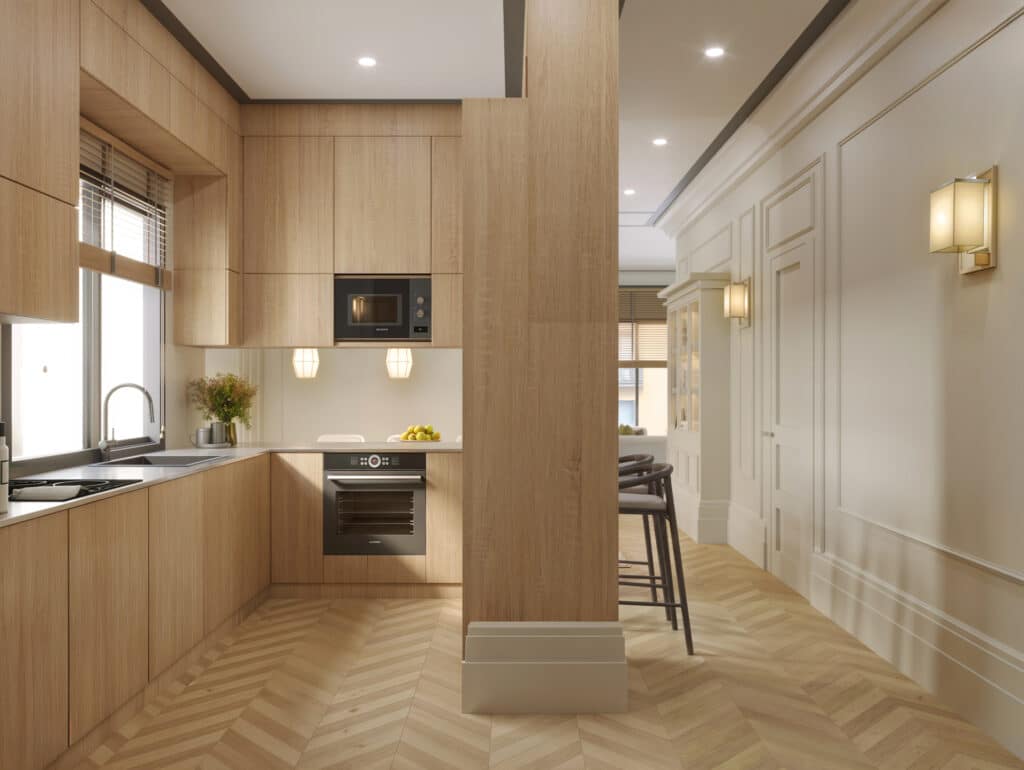 Kitchens are designed in warm, neutral tones, featuring natural wood or matte metallic-style finishes and fully integrated, high-end appliances, combining visual clarity with everyday functionality.