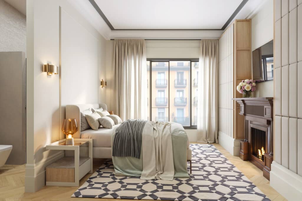 Interiors stand out for their refined detailing and the use of premium materials. Large double-glazed windows enhance natural light throughout the homes, highlighting the herringbone natural oak parquet flooring that creates visual continuity across all living spaces. Decorative wall paneling and bespoke skirting boards, designed specifically for each residence, reinforce the architectural elegance of the building.